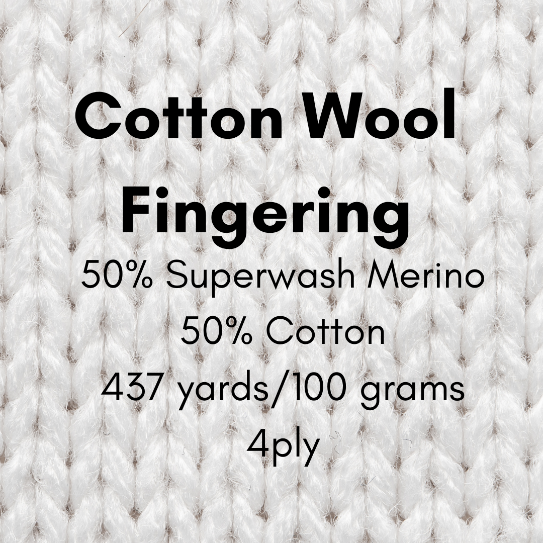 Cotton Wool Fingering is a luxurious blend of superwash merino and soft cotton, offering a smooth, versatile yarn perfect for all your fingering-weight projects. With its beautiful drape and gentle texture, it’s ideal for everything from lightweight garments and accessories to intricate lace designs and textured stitches.
