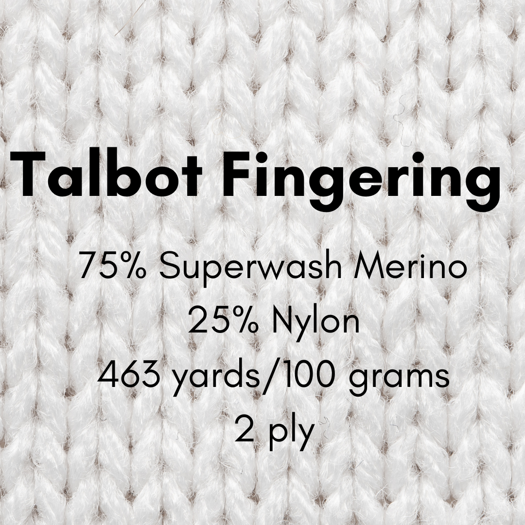 Talbot Fingering 75/25 is a high-performance yarn combining 75% superwash merino and 25% nylon, offering both softness and durability. The superwash merino provides a gentle, luxurious feel, while the nylon adds strength and elasticity, making this yarn perfect for everything from socks to shawls and lightweight garments. It has a smooth texture that enhances stitch definition and offers excellent wearability, even with frequent use.