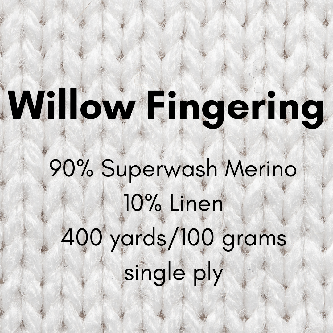 Willow Fingering is a beautifully soft single-ply yarn, expertly crafted from 90% superwash merino and 10% linen. The unique blend creates a yarn with a subtle texture and a gentle tweed-like haze, offering a natural elegance. The linen adds an intriguing finish, giving the yarn a slightly crisp feel and a delicate drape that’s perfect for transitional-season garments. Ideal for lightweight shawls, cowls, and tops, Willow Fingering brings sophistication and versatility to your projects.